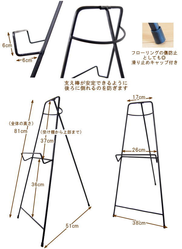 シンプルデザインのディスプレイ用イーゼル ・Spec 商品名 アイアンイーゼル(L) 素材 アイアン サイズ 全体 w約38cm×d約57cm(受け棚含めて)×h約81cm 1530g ※支えの脚部分は開閉します ※商品により多少の誤差がございます ※ハンドメイドの為表情に若干の違いがあります。