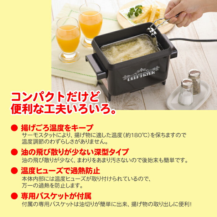●揚げごろ温度をキープサーモスタットにより、揚げ物に適した温度(約180℃)を保ちますので温度調節のわずらわしさがありません。