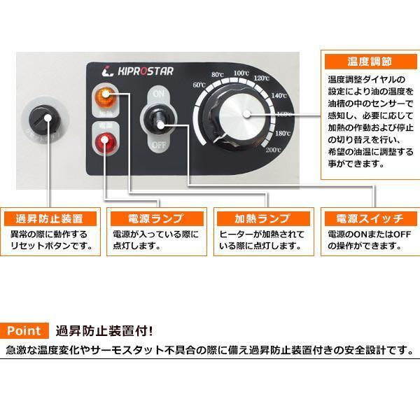 業務用 電気フライヤー 9FLT 商品説明 【型式】PRO-9FLT 【外形寸法】約 幅290 × 奥行 450 × 高さ 380mm 【電源】単相100V 【消費電力】1400W 【油量】9リットル (最低:6L ) 【温度調節】60℃〜200℃ 【付属品】揚げカゴ・フタ(各1個) 【重さ】6.5kg 【メーカー】KIPROSTAR 【保証】 当社1年保証 保証期間外でも当社へご連絡頂ければ修理・メンテナンス等、迅速に対応させて頂きますのでお気軽に当社へご相談下さい。